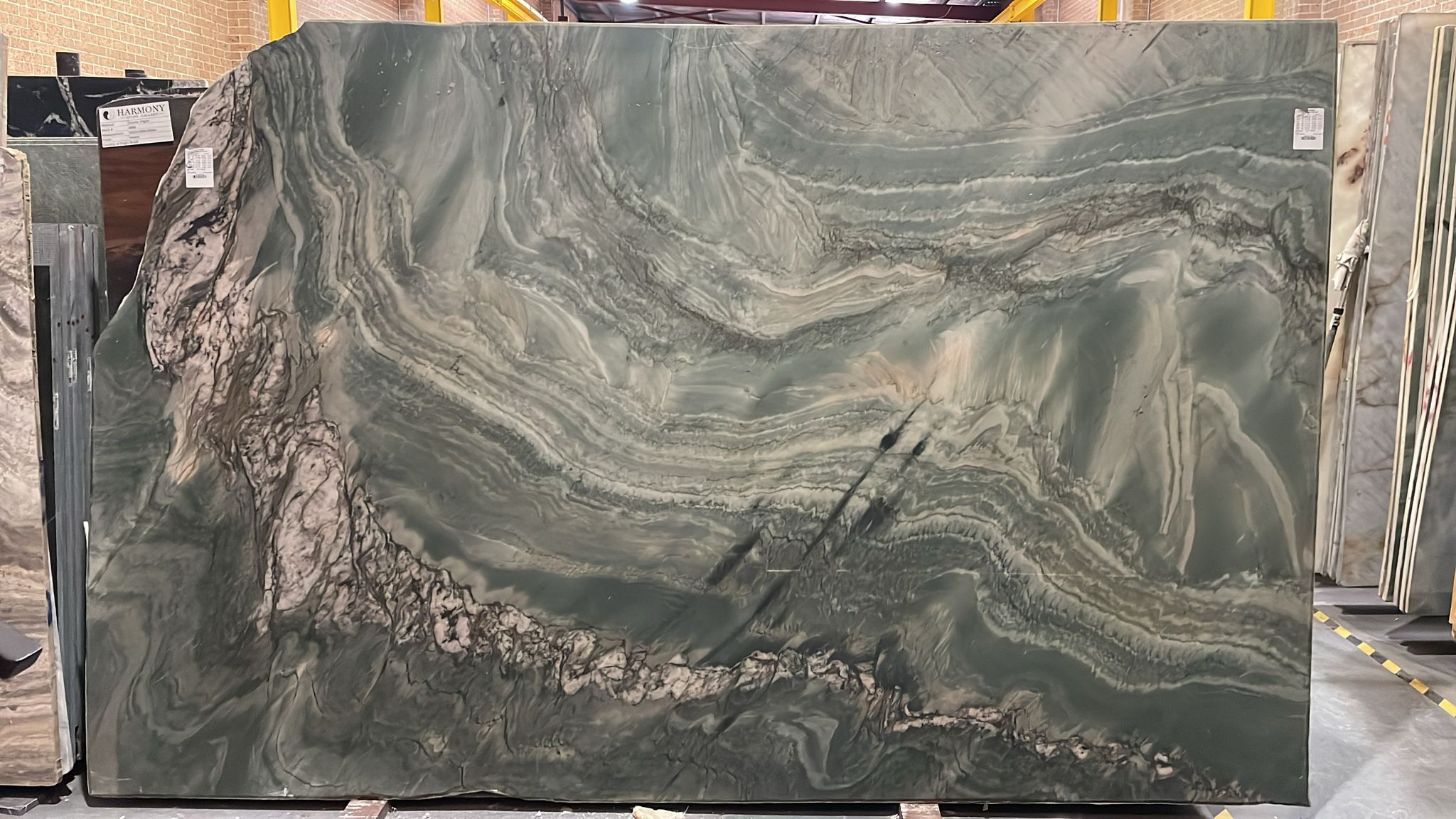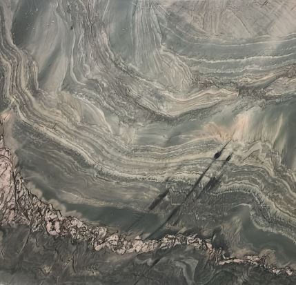 Maestro Quartzite features a striking palette of deep green and soft sage tones, layered with flowing bands of white, grey, and charcoal. The surface is defined by dramatic, wave-like veining that moves across the slab in sweeping, organic patterns, creating a sense of depth and motion.