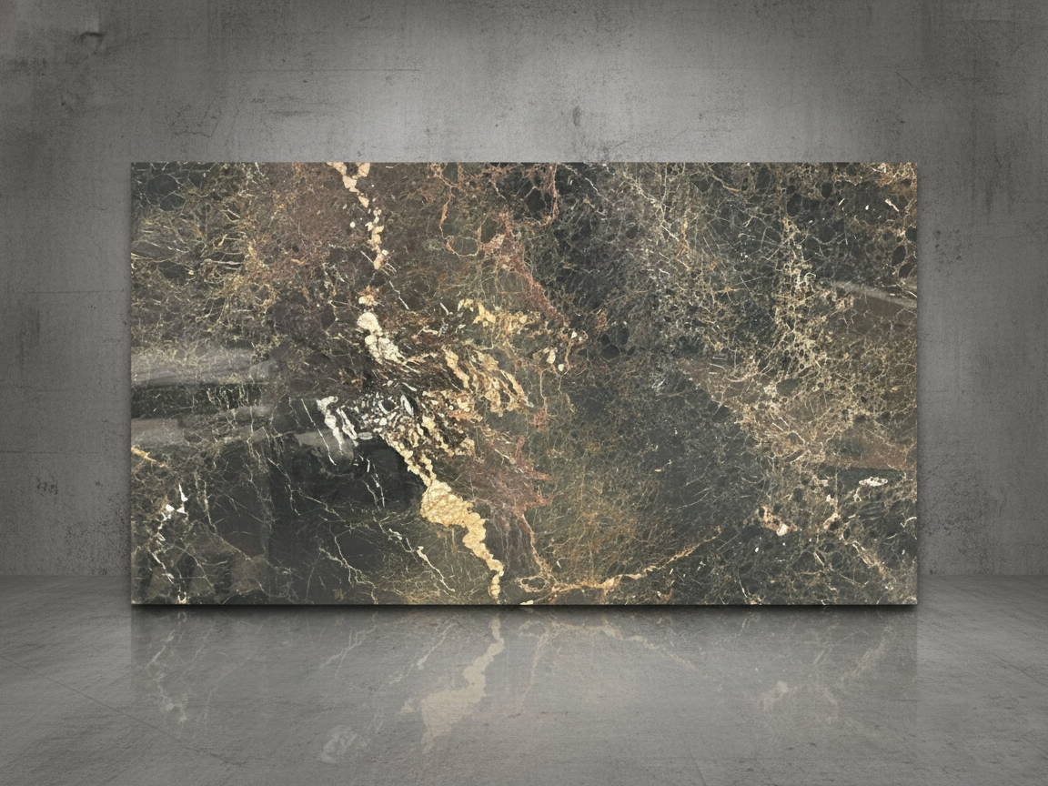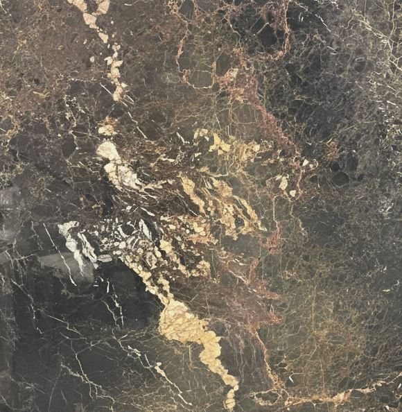 Marshal Marble presents a deep espresso to charcoal brown base interlaced with a network of fine golden, amber, and ivory veining. The veining varies from thin linear fractures to bold mineral clusters, creating a dramatic contrast and a rich, organic movement across the slab. Subtle undertones of warm rust and taupe may appear in certain sections, adding depth and visual interest.