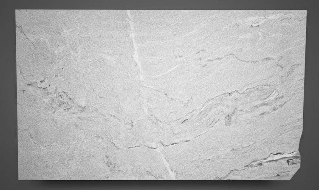 Viscon Granite is characterized by its light grey to off-white base with dynamic, sweeping veins in shades of charcoal, graphite, and soft black. The veining forms natural wave-like patterns, giving the stone a sense of movement and variation from slab to slab. It has a medium to fine-grained texture with occasional crystalline flecks that add subtle depth under polished or honed finishes.